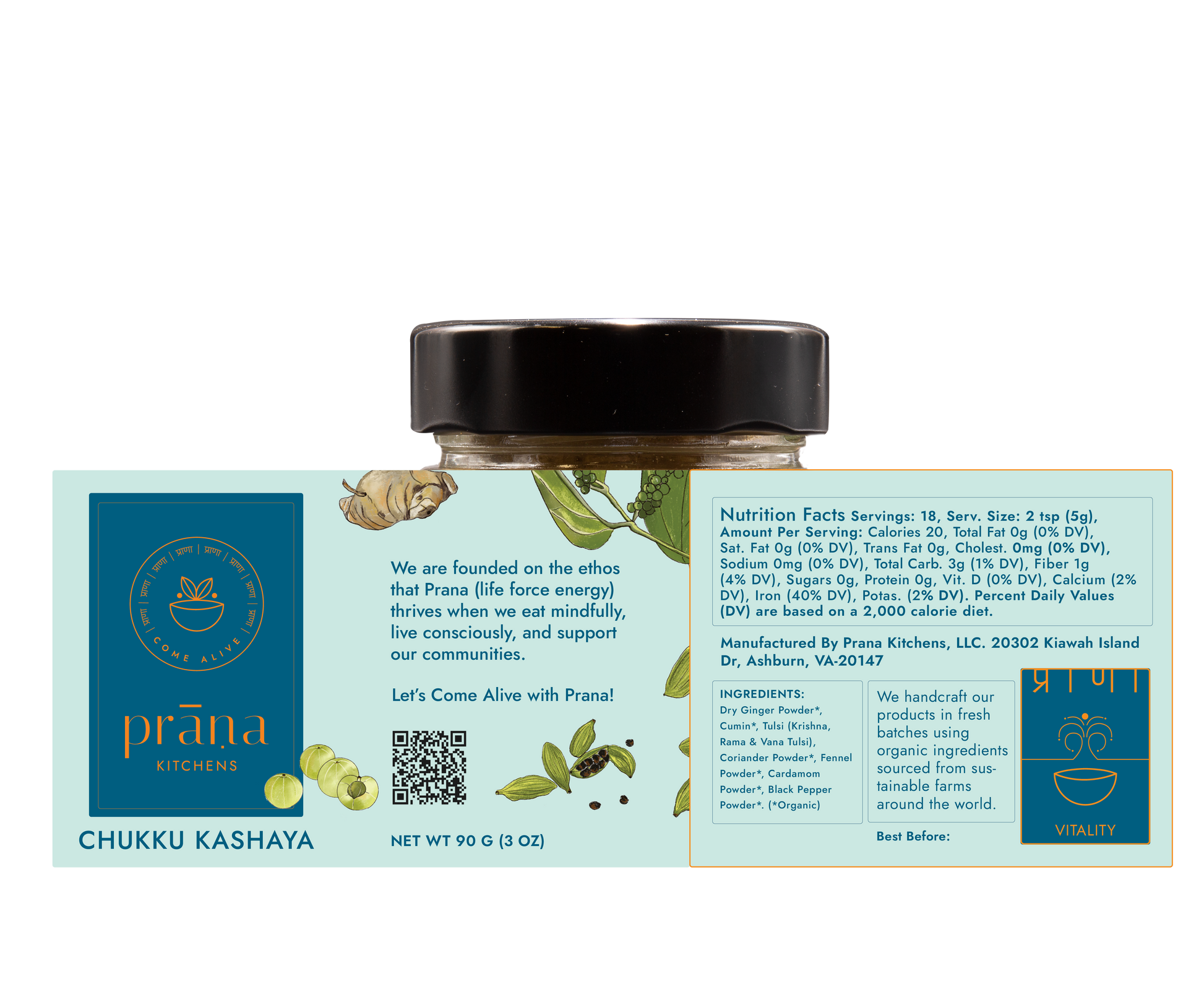 INGREDIENTS: DRY GINGER POWDER*, CUMIN*, TULSI* (KRISHNA, RAMA & VANA TULSI), CORIANDER POWDER*, FENNEL POWDER*, CARDAMOM POWDER*, BLACK PEPPER*. (*ORGANIC)