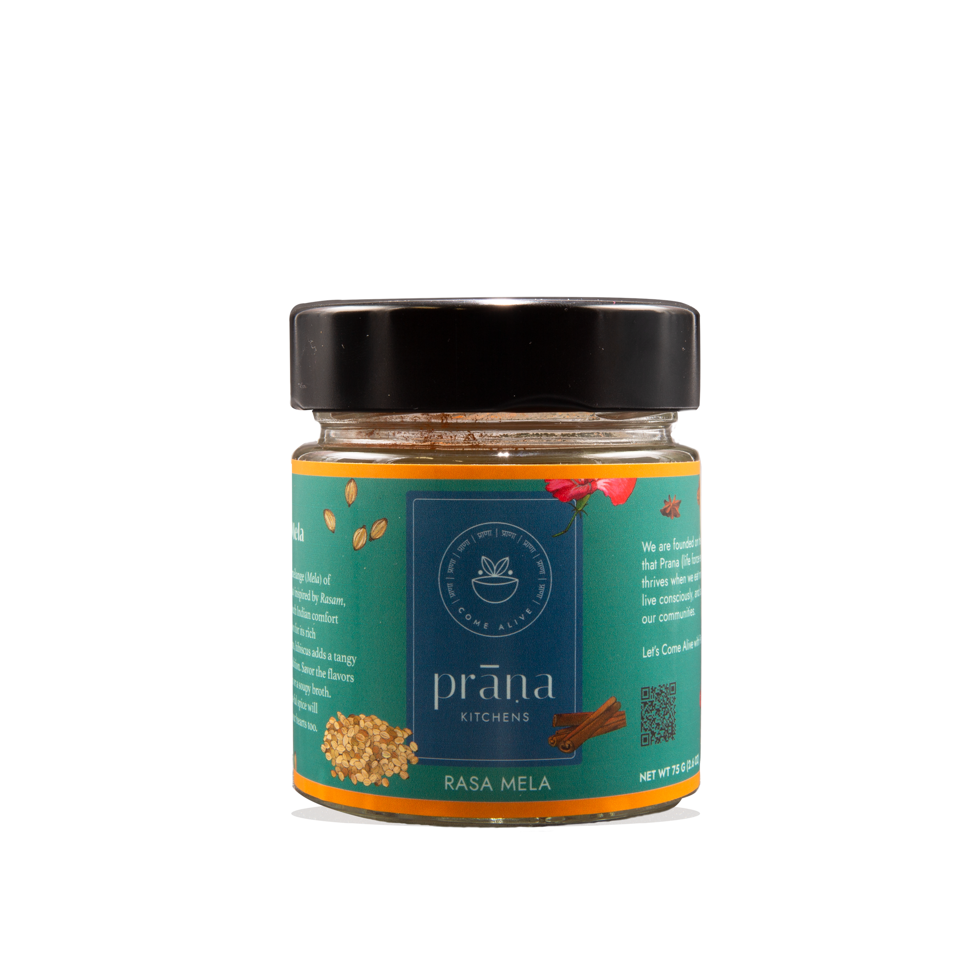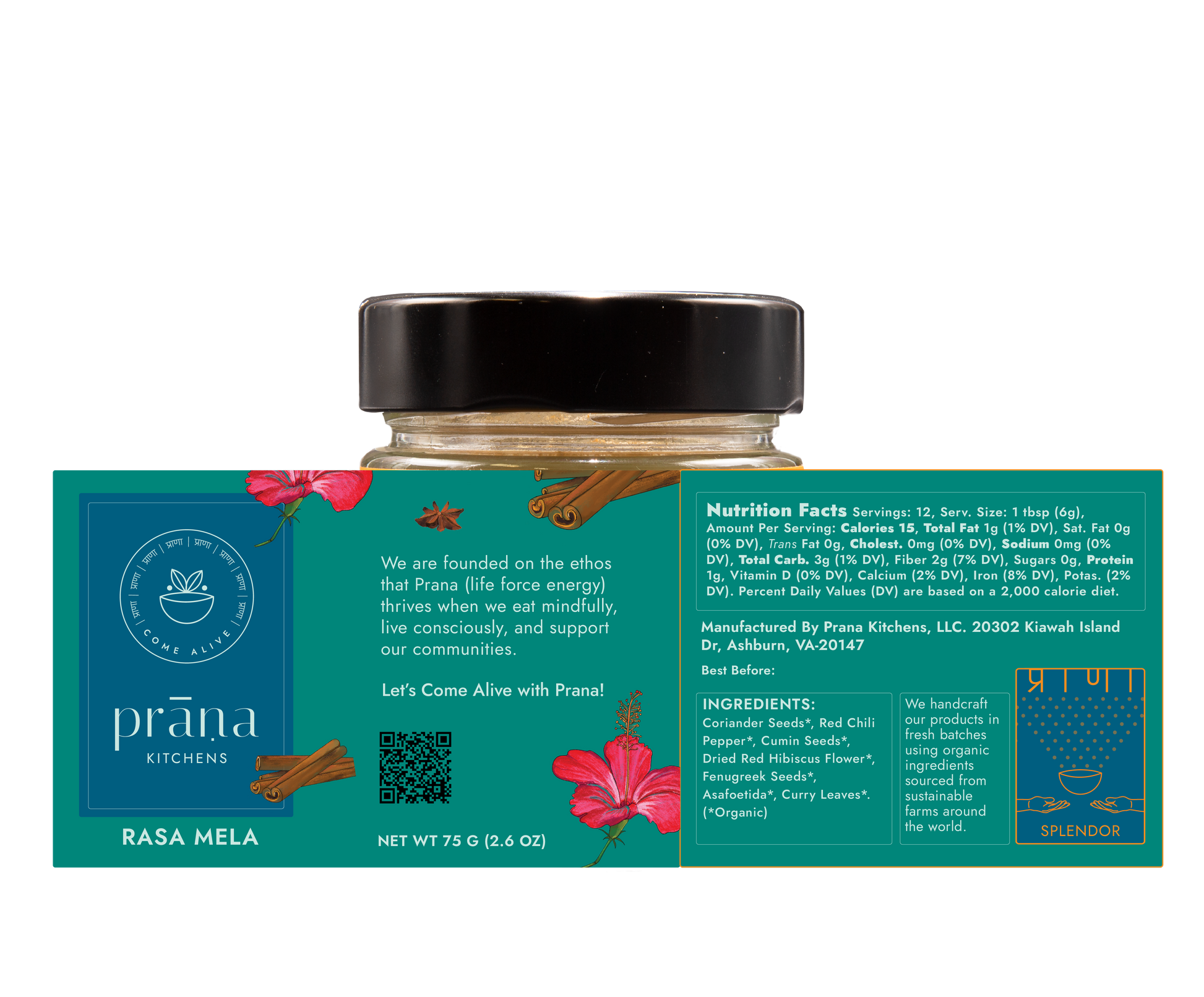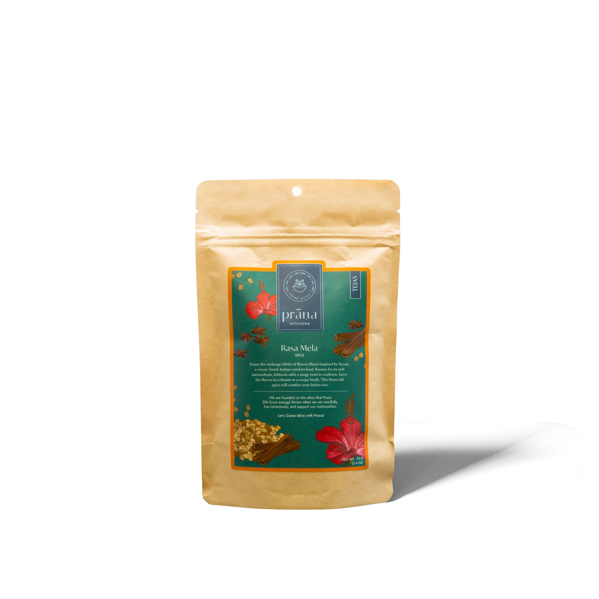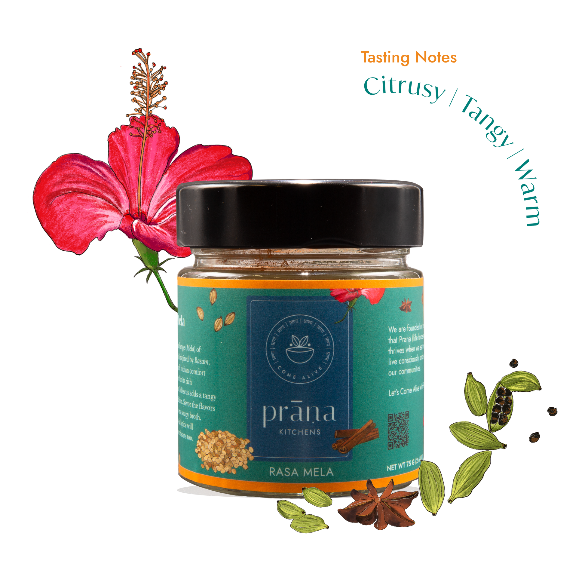 Enjoy this mélange (Mela) of flavors (Rasa) inspired by Rasam, a classic South Indian comfort food. Known for its rich antioxidants, hibiscus adds a tangy twist to tradition. Savor the flavors in a Rasam or a soupy broth. This Prana-ful spice will comfort your hearts too.